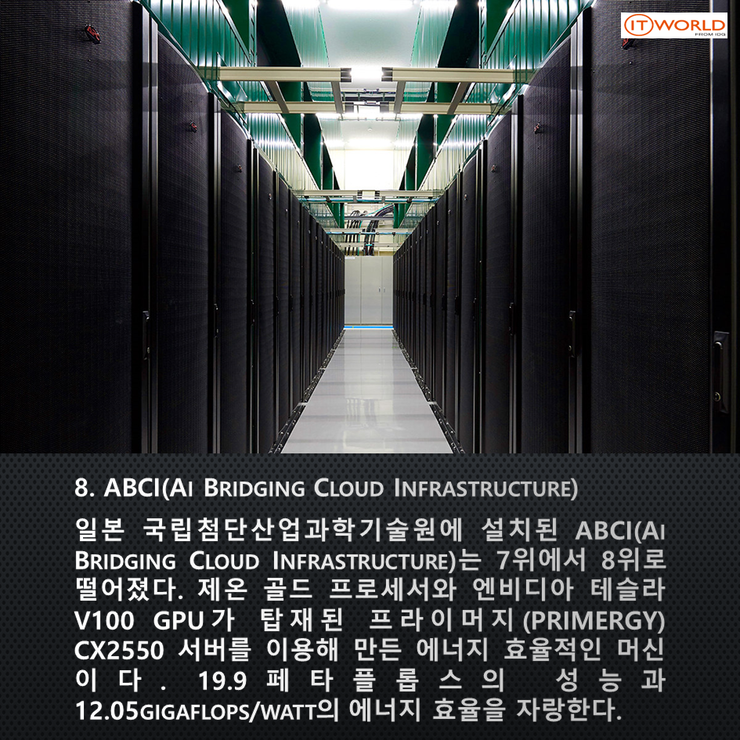 8. ABCI(Ai Bridging Cloud Infrastructure) 일본 국립첨단산업과학기술원에 설치된 ABCI(Ai Bridging Cloud Infrastructure)는 7위에서 8위로 떨어졌다. 제온 골드 프로세서와 엔비디아 테슬라 V100 GPU가 탑재된 프라이머지(PRIMERGY) CX2550 서버를 이용해 만든 에너지 효율적인 머신이다. 19.9페타플롭스의 성능과 12.05gigaflops/watt의 에너지 효율을 자랑한다.
