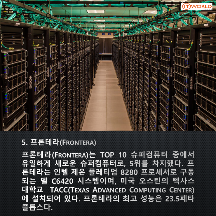 5. 프론테라(Frontera) 프론테라(Frontera)는 TOP 10 슈퍼컴퓨터 중에서 유일하게 새로운 슈퍼컴퓨터로, 5위를 차지했다. 프론테라는 인텔 제온 플레티엄 8280 프로세서로 구동되는 델 C6420 시스템이며, 미국 오스틴의 텍사스 대학교 TACC(Texas Advanced Computing Center)에 설치되어 있다. 프론테라의 최고 성능은 23.5페타플롭스다.
