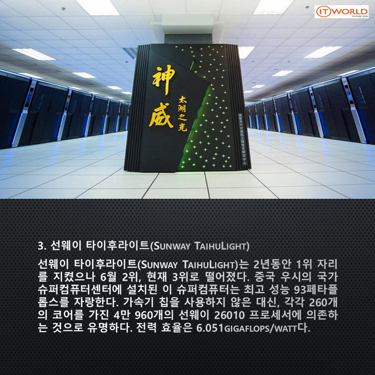 3. 선웨이 타이후라이트(Sunway TaihuLight) 선웨이 타이후라이트(Sunway TaihuLight)는 2년동안 1위 자리를 지켰으나 6월 2위, 현재 3위로 떨어졌다. 중국 우시의 국가슈퍼컴퓨터센터에 설치된 이 슈퍼컴퓨터는 최고 성능 93페타플롭스를 자랑한다. 가속기 칩을 사용하지 않은 대신, 각각 260개의 코어를 가진 4만 960개의 선웨이 26010 프로세서에 의존하는 것으로 유명하다. 전력 효율은 6.051gigaflops/watt다.