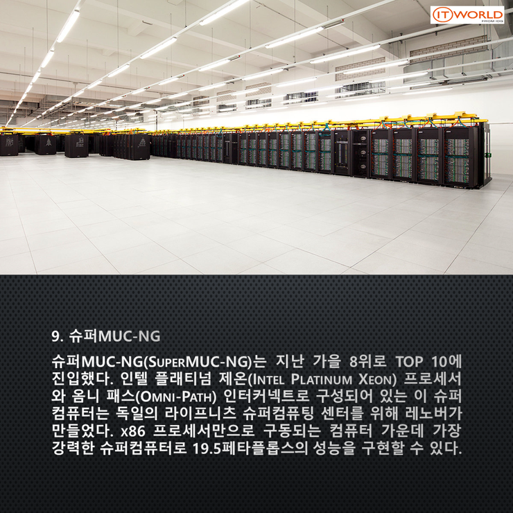 9. 슈퍼MUC-NG 슈퍼MUC-NG(SuperMUC-NG)는 지난 가을 8위로 TOP 10에 진입했다. 인텔 플래티넘 제온(Intel Platinum Xeon) 프로세서와 옴니 패스(Omni-Path) 인터커넥트로 구성되어 있는 이 슈퍼컴퓨터는 독일의 라이프니츠 슈퍼컴퓨팅 센터를 위해 레노버가 만들었다. x86 프로세서만으로 구동되는 컴퓨터 가운데 가장 강력한 슈퍼컴퓨터로 19.5페타플롭스의 성능을 구현할 수 있다.