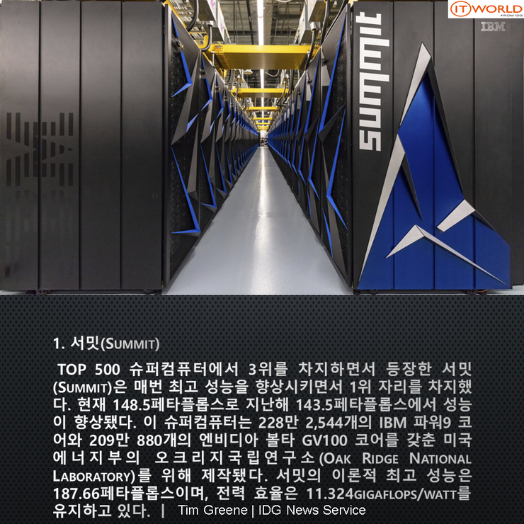 1. 서밋(Summit) TOP 500 슈퍼컴퓨터에서 3위를 차지하면서 등장한 서밋(Summit)은 매번 최고 성능을 향상시키면서 1위 자리를 차지했다. 현재 148.5페타플롭스로 지난해 143.5페타플롭스에서 성능이 향상됐다. 이 슈퍼컴퓨터는 228만 2,544개의 IBM 파워9 코어와 209만 880개의 엔비디아 볼타 GV100 코어를 갖춘 미국 에너지부의 오크리지국립연구소(Oak Ridge National Laboratory)를 위해 제작됐다. 서밋의 이론적 최고 성능은 187.66페타플롭스이며, 전력 효율은 11.324gigaflops/watt를 유지하고 있다.