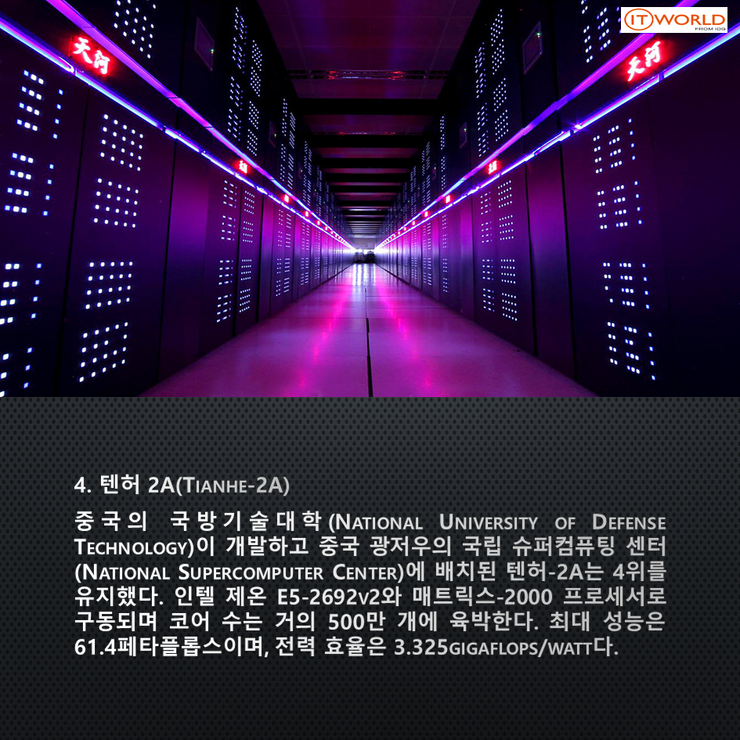4. 텐허 2A(Tianhe-2A) 중국의 국방기술대학(National University of Defense Technology)이 개발하고 중국 광저우의 국립 슈퍼컴퓨팅 센터(National Supercomputer Center)에 배치된 텐허-2A는 4위를 유지했다. 인텔 제온 E5-2692v2와 매트릭스-2000 프로세서로 구동되며 코어 수는 거의 500만 개에 육박한다. 최대 성능은 61.4페타플롭스이며, 전력 효율은 3.325gigaflops/watt다.