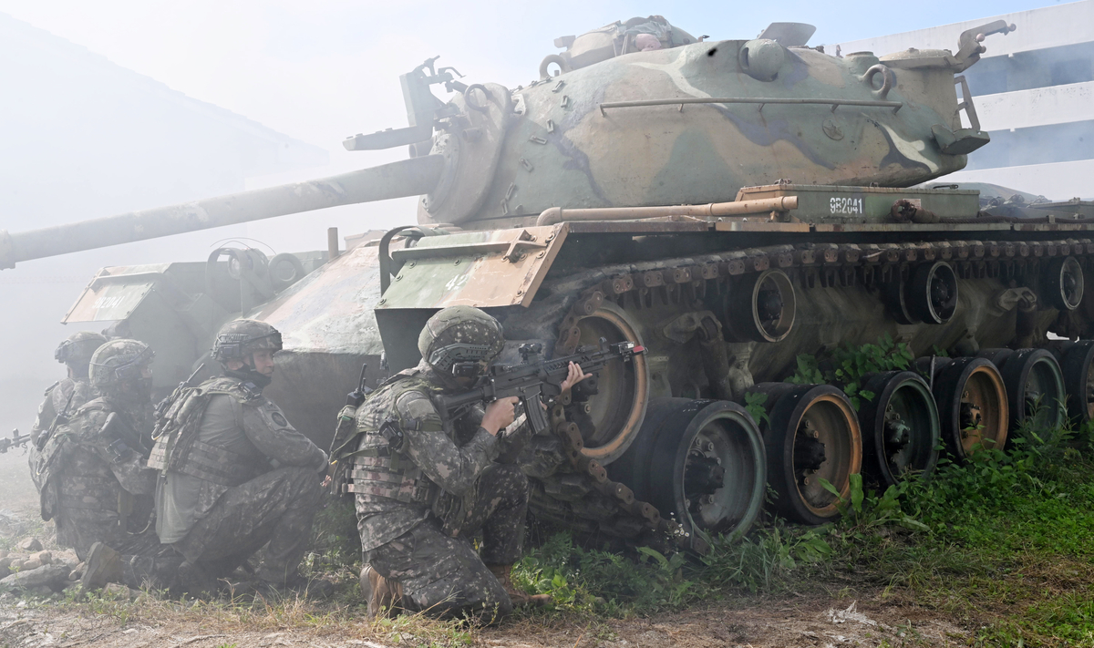25일 강원도 인제군 육군 과학화훈련단(KCTC) 도시지역훈련장에서 열린 제3회 국제 과학화전투 경연대회(K-ICTC)에서 다국적 연합군 장병들이 경계지역 전투를 벌이고 있다. 2025.9.25 사진공동취재단